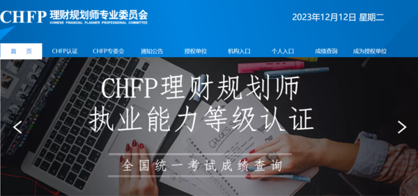 发表时间:2023-12-13 09:30网址:http://www.chfp.org 理财规划师(CHFP)专业委员会 秘书处[54]号 目前2023年11月份“理财规划师(CHFP)执业能力等级认证考试”成绩已经开放查询。 一、考生可直接访问CHFP专委会官网(https://www.chfp.org)查询成绩信息,如下步骤: 1、点击成绩查询横图。